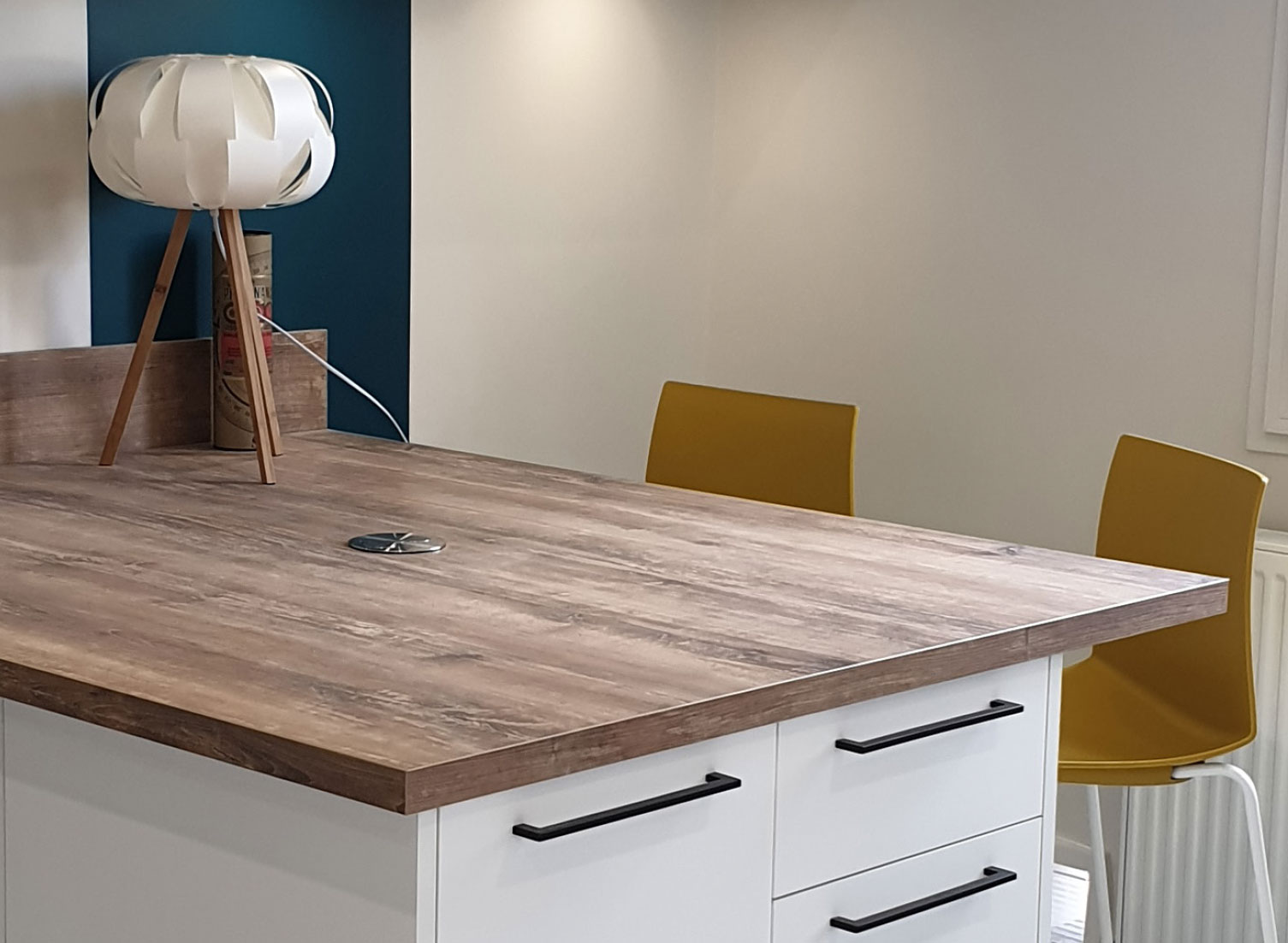 Une harmonie chromatique à la fois contemporaine et chaleureuse entre les différents composants (façades du mobilier, plan de travail et murs). Nous avons proposé une bande de couleur contrastée (Eucalyptus Intense), qui met en valeur la tonalité jaune doré des chaises.
