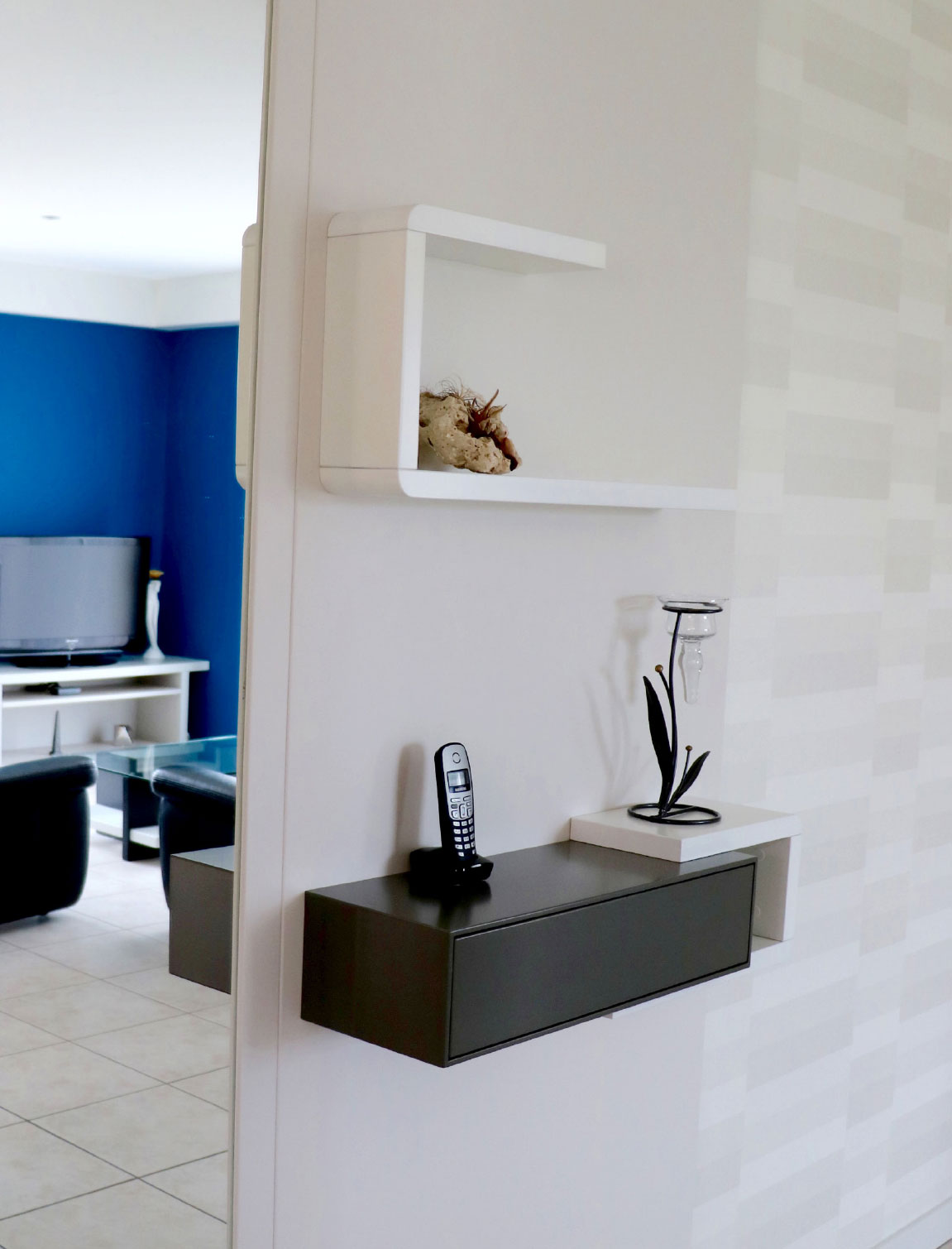 - Réalisation complète de l’embellissement en peintures et papier peint (préparation des supports et réparation des fissures du plafond, révision au phare, teintes sur mesure, application de peintures sur les murs, menuiseries et le module cheminée).